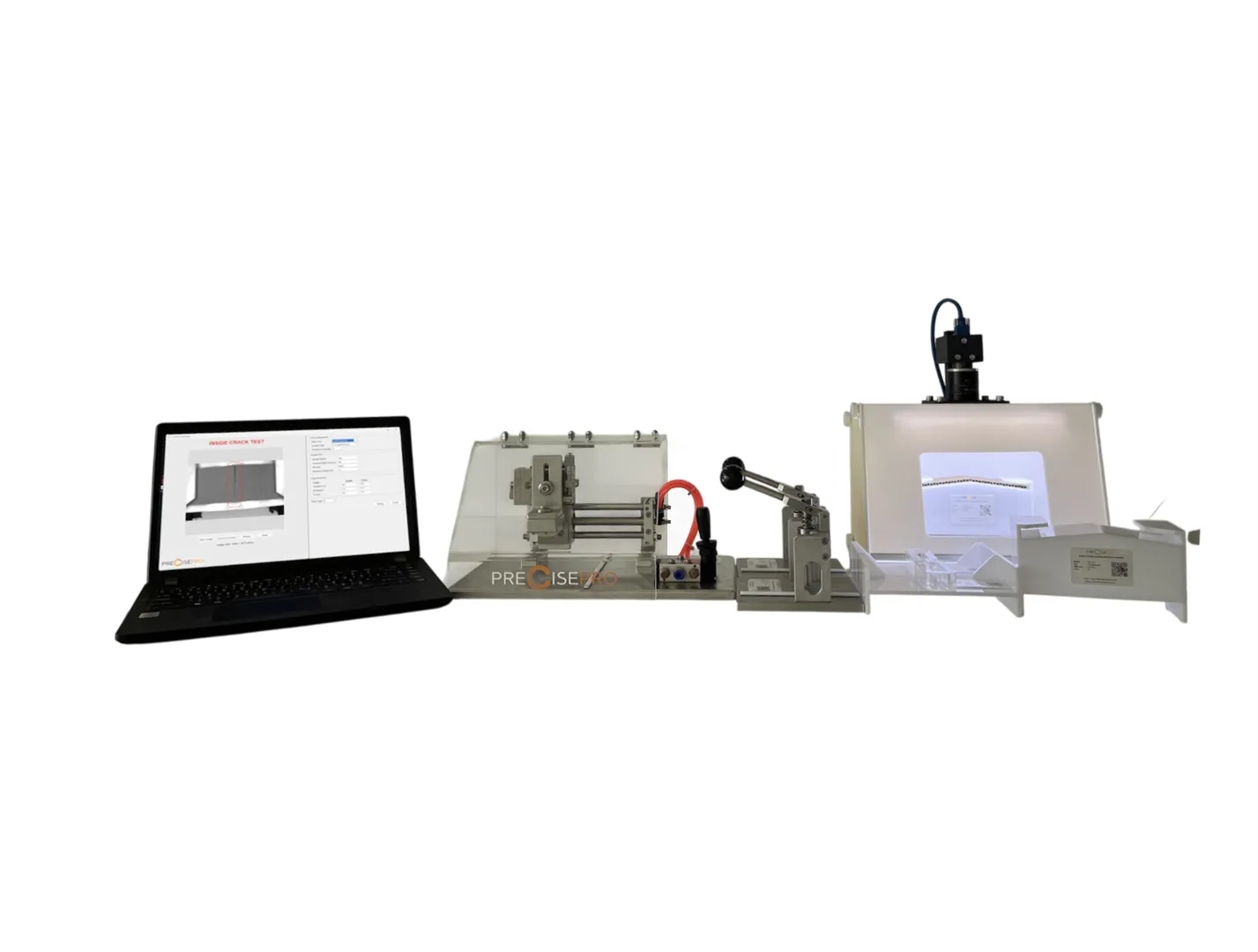 เครื่อง Inside-Outside Cracking Analyzer เป็นเครื่องที่จำลองการทับรอย และตรวจเช็ความเสียหายที่เกิดขึ้น ด้วยโปรแกรม ที่สามารถแบ่งระดับความเสียของตัวอย่างได้ ทำให้เราสามารถคัดแยกระดับความเสียของตัวอย่างเป็นแต่ละระดับได้ (Outside cracking) รวมถึงสามารถคำนวณ % การแตกของการแตกแบบด้านใน (Inside cracking)